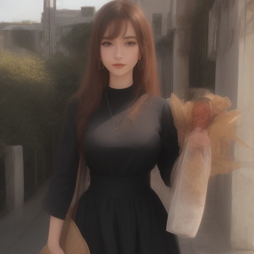 InCasestyle, 1girl,solo,long hair,breasts,blush,smile,brown hair,black hair,long sleeves,dress,holding,jewelry,earrings,food,necklace,black dress,cross,hand on own chest,long dress,basket,nun,habit,cross necklace,bread,holding basket,catholic