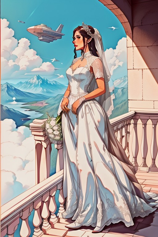 Illustration of a woman wearing a wedding dress while standing on a balcony overlooking a mountain range as spaceships descend through the clouds