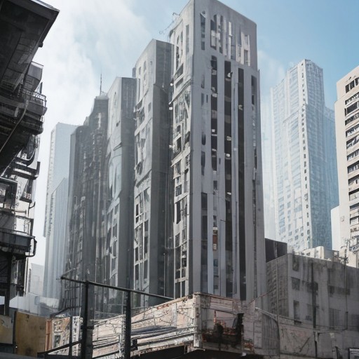 tall, narrow, tower, dystopian, black, Hong Kong, billboards, air conditioning units, short buildings around the main building