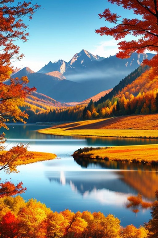 outdoors, autumn, lake, tree, mountain, falling leaves, wind