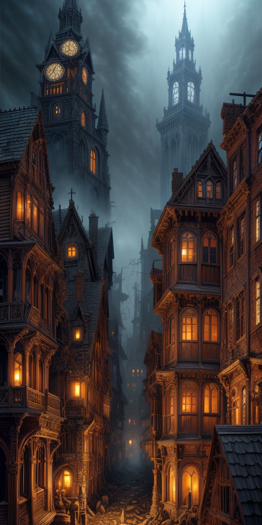 a hyper realistic photograph of a gothic steampunk night village, apocalyptic environment, exquisite detail, Glenn Brown & Darrell K. Sweet style, bionic, powerful punch, trending on artstation, sharp focus, HDR++<lora:more_details:1>