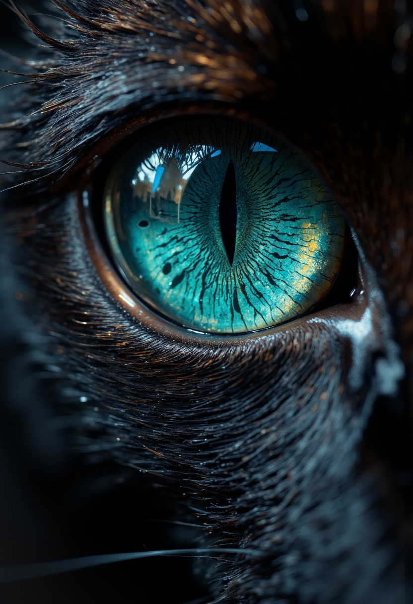 Focus on the textured surface of a cats eye and slight part of its nose and mouth,capturing the dense network of tiny, repeating dimples that create a fractal-like pattern. Use an ultra macro lens to isolate a small section of the eye,emphasizing the tactile detail of its teal surface. Side lighting enhances the dimensionality of each line, casting subtle shadows across the cats smooth black fur Position the camera to balance symmetry and organic randomness, creating a dynamic yet harmonious composition. The vivid teal hue of the eye dominates the frame, with blurred highlights in the background adding a sense of warmth and depth. This close-up transforms an everyday object into a study of micro-scale fractal beauty.