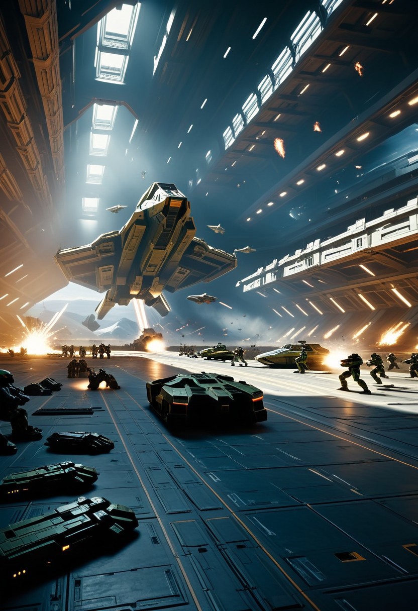 Photograph of a spaceship hangar during a battle scene, featuring Master Chief from Halo in dynamic action. The composition focuses on intricate details, especially in the background, showcasing the high-tech, futuristic environment with immense depth and clarity. The hangar is filled with advanced machinery, starships, and battle debris. The atmosphere is tense with smoke, sparks, and explosions. The lighting is dramatic, with strong contrasts and cinematic shadows. The shot is epic and dynamic, capturing intense movement while highlighting the finer textures of the scene. High resolution, with enhanced focus on small details in the background and surroundings, creating an immersive and detailed epic scene.