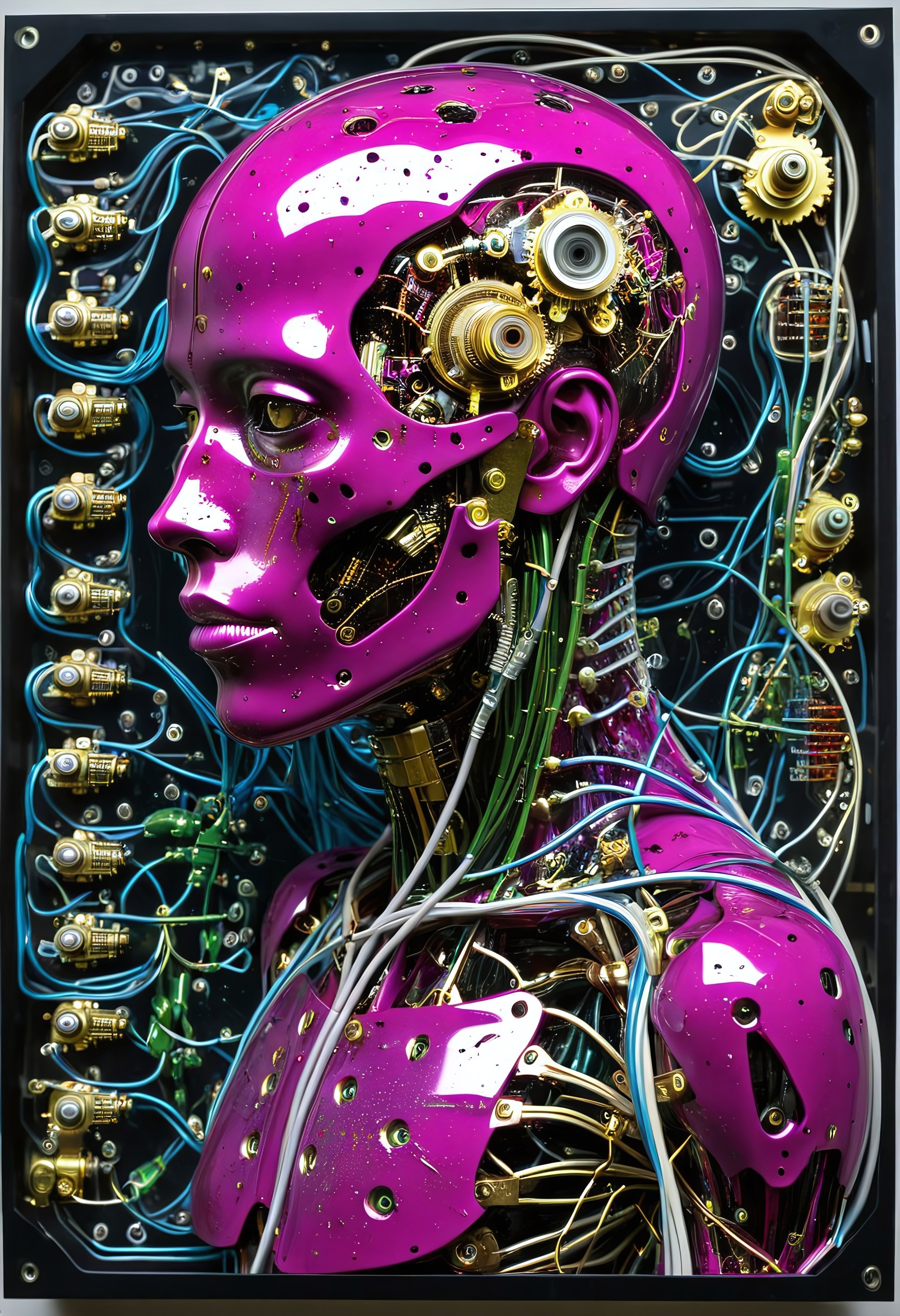 Blame! by Tsutomu Nihei see through cyborg, looking at viewer, magenta oil splatter, is flying through a void of blue, golden plated cables everywhere, translucent glass head, gears in background, black oil splatter, green everywhere, symbiotic everywhere, insects everywhere titanium everywhere, electric everywhere, easynegative, ng_deepnegative_v1_75t