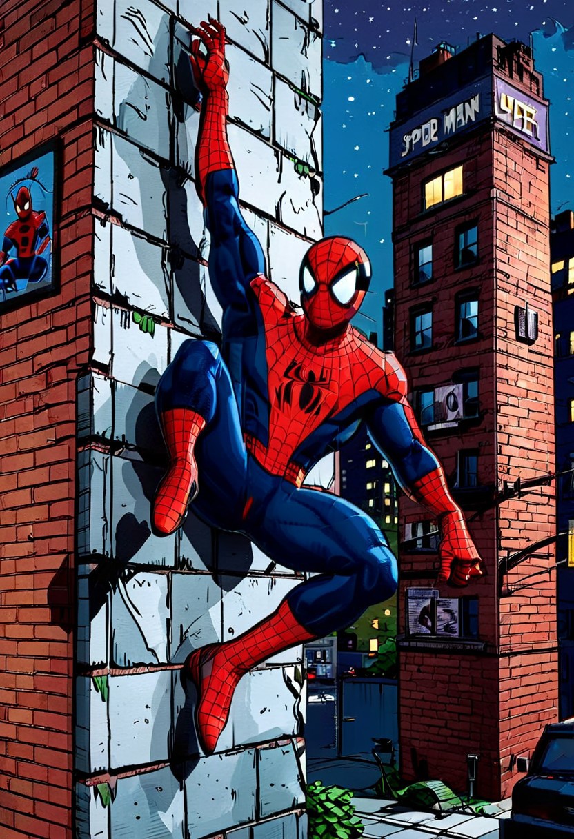 spider-man, 1 figure clinging to a wall at night, new york city, heroic,
