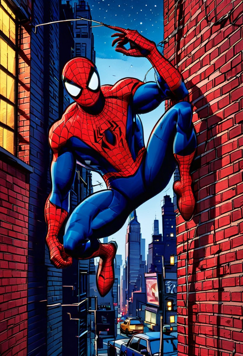 spider-man, 1 figure clinging to a wall at night, new york city, heroic,