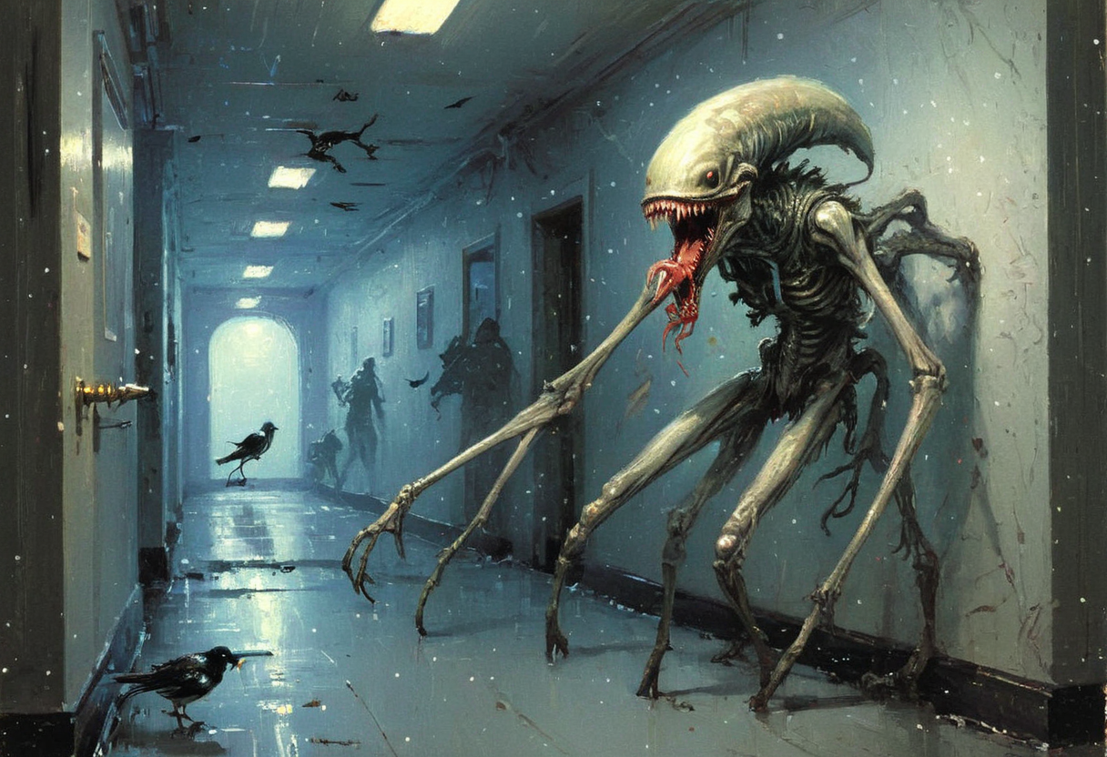 <lora:mgl_Soviet_New_Year_Postcards>, 100 spirits bottles, detailxl, soviet new year postcard, (s novym godom logo:1), winter, space, cosmic landscape, scifi, dusk, style of Peter Wileman, Alvaro Castagnet, jeremy mann, anders zorn, john harris, bob layzell, john berkey, shade of saturated, xenomorph, scifi, horror vibes, Creepy, real image of a grotesque creature with unnaturally long limbs in a dimly lit hallway, pale skin with bulging veins, empty black eyes, wide mouth filled with sharp, jagged teeth, bird,cartoon,