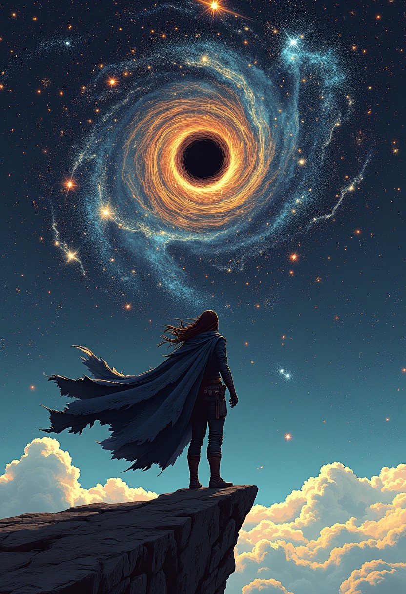 NewFantasyCore, A hero with a cloak made of galaxies and hair that flows like a black hole, standing on the edge of reality as they pull an entire alternate dimension into existence with their bare hands. Style: cosmic fantasy with psychedelic and surreal tones.