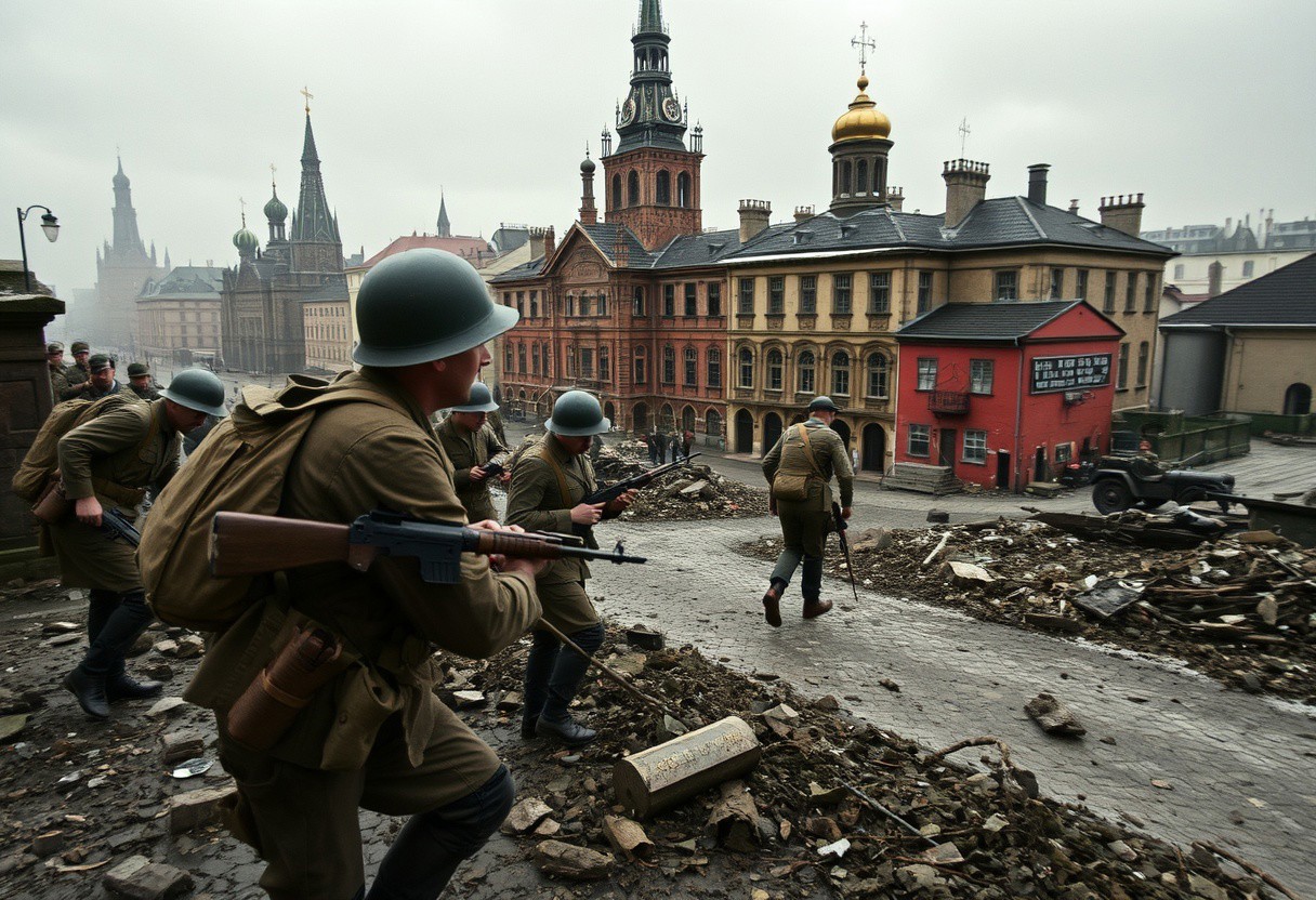 ww2, land war, scene, british soldiers, takein cover, war torn cityscape, russia,