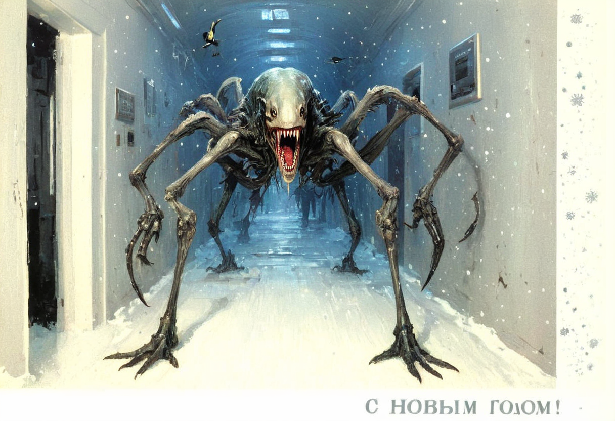 <lora:mgl_Soviet_New_Year_Postcards>, 100 spirits bottles, detailxl, soviet new year postcard, (s novym godom logo:1), winter, space, cosmic landscape, scifi, dusk, style of Peter Wileman, Alvaro Castagnet, jeremy mann, anders zorn, john harris, bob layzell, john berkey, shade of spectral color, xenomorph, scifi, horror vibes, Creepy, real image of a grotesque creature with unnaturally long limbs in a dimly lit hallway, pale skin with bulging veins, empty black eyes, wide mouth filled with sharp, jagged teeth, bird,white background,moscow,