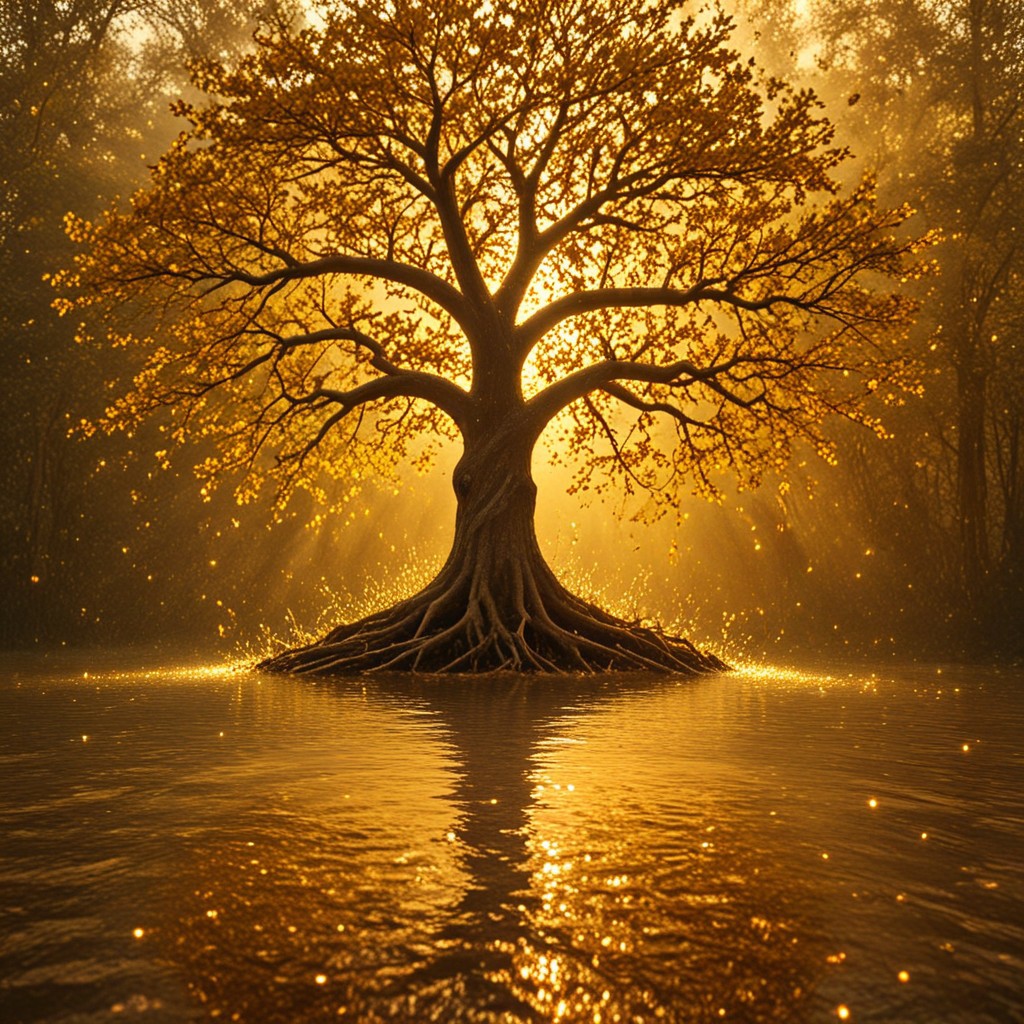 hyper detailed, water horizon, divine tree emerges from water, encircled tree, spiral , golden glow, golden lake, golden dust, sparkles, glitter midjourneyv6.1, nutcracker