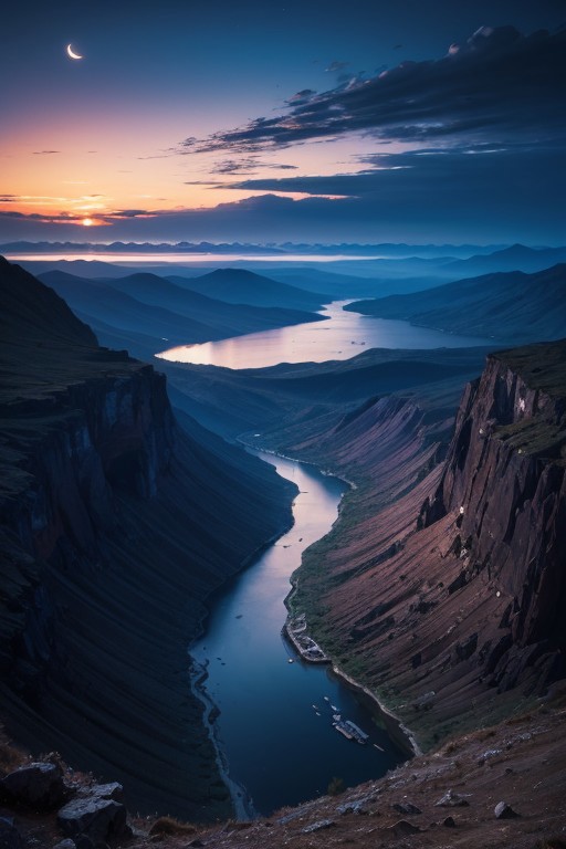 full shot,River,Mountains,forests,half moon, clouds, beautiful sky, night, epic landscape, desolate atmosphere, from above, photorealistic, masterpiece, 64k, UHD, ultra detailed, vivid colors, high quality, sharp focus