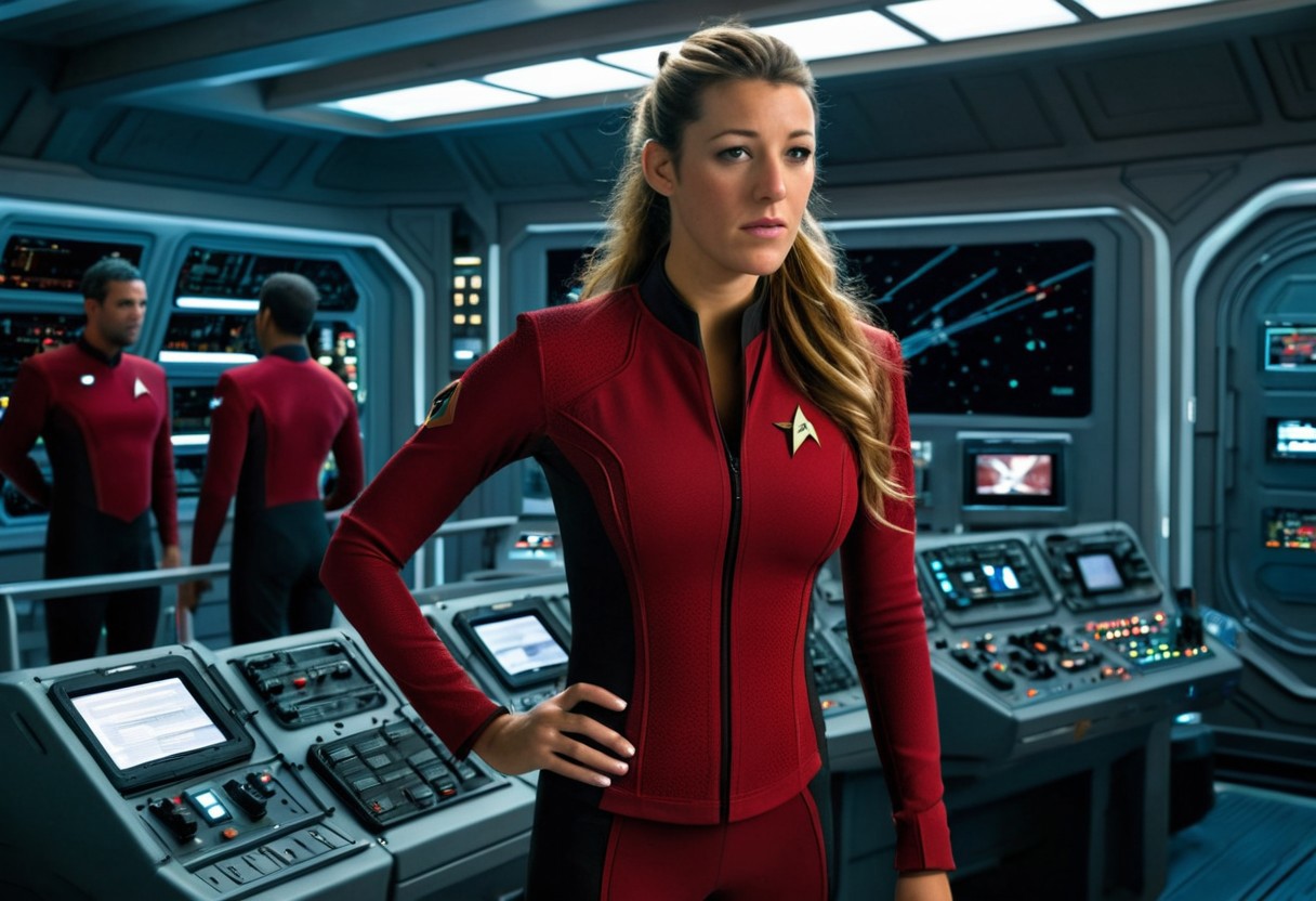 Blake lively in red star trek uniform. Standing in high tech engine room. Serious look. Three quarter look. Sweating. Large room with electronic equipment around walls. Electronics cover walls. Other female crew members in background.