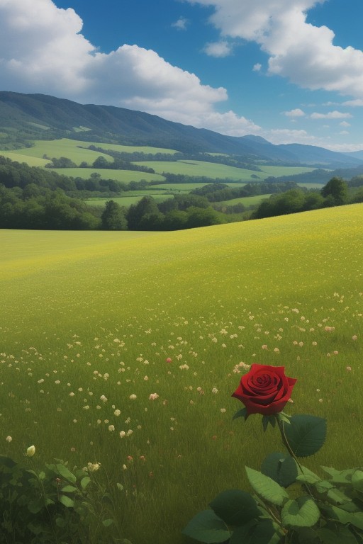 Valley, field, red roses, very detailed, a lots of roses, blue sky, clouds, sun, green grass, no humans