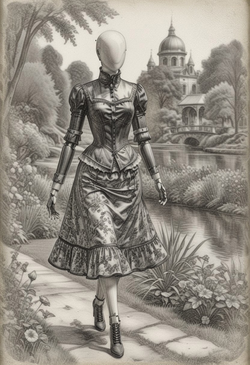 Pencil monochrome black and white drawing of a bald female faceless mannequin with robot joints wearing victorian dress, walking in a garden, next to the river, nature and florals <lora:VintageDrawing01-00_CE_SDXL_128OT:0.6>