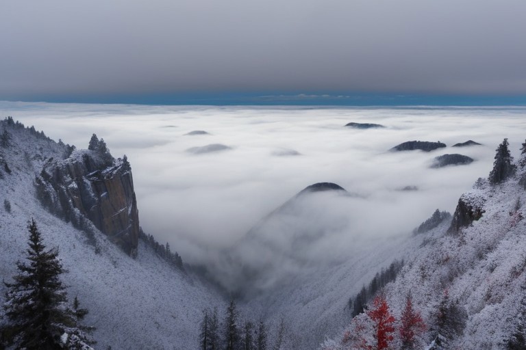over looking a cliff high up a mountain, see the valley below, fog coming in, at the top are red trees