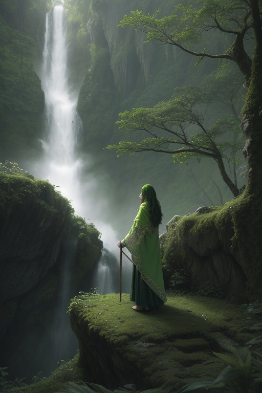 (masterpiece), (extremely intricate:1.3), (realistic), bright lighting, (bright green aesthetic:1.3), (moss style:1), a female druid holding a staff made of branches, standing on a rocky precipice overlooking a vast, sunlit valley dotted with ancient ruins and dense forests. meticulous flower decorated shawl, a flowing green cloak made of leaves flutters behind her in the mountain breeze, flower bloom on her clothing. Distant waterfall, deep gray storm clouds, sharp focus, dramatic, award winning, cinematic lighting, octane render unreal engine, plants in foreground, from behind,