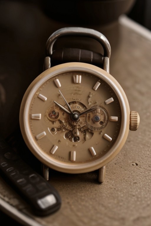 a inside of a mechanical golden watch with all the gears and mechanics laying on marble table near to a steaming cup of coffee in a black mug. outside there is sunlight, watch focus