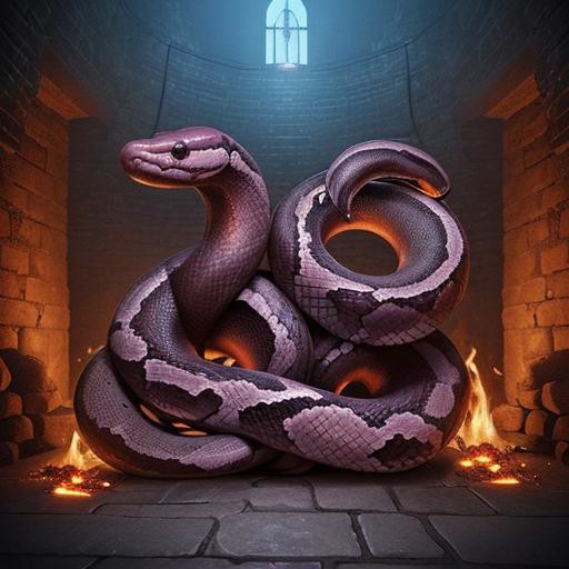 two very long very thick very muscular dark pink phallic-like glossy powerful snakes with huge dog oiled around each other together in a fire bit in a dungeon