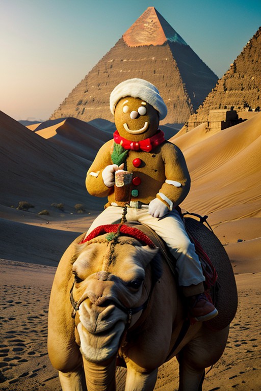 Gingerbread_Man, Riding a Camel, In the desert, pyramid, sunrise, food, cookie, food focus, no humans, cinematic, (masterpiece, best quality:1.4), ultra-high res, 4k, Photorealistic, insanely detailed, sfw,