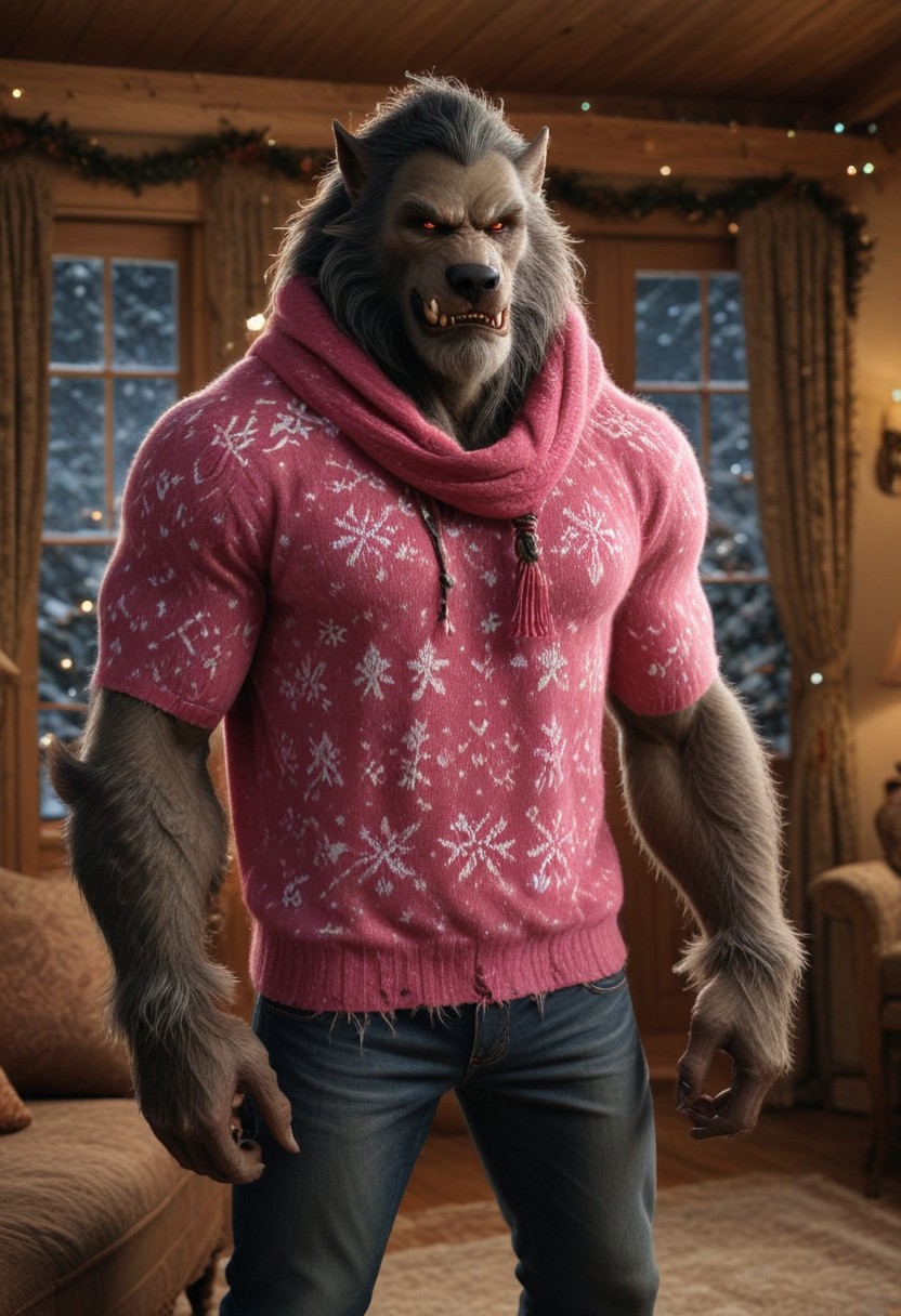 score_9, score_8_up, score_7_up, (worgen), (werewolf), male, muscular, ripped, detailed background, forest background, red eyes, menacing look, Pink sweater outfit, green scarf, pale skin, solo, hairy, long beard, runic silver ornaments, fur cloak, standing up straight in livingroom,, indoors, wrapped in warmth and holiday cheer, surrounded by snowflakes and twinkling Christmas lights,calm face, closed mouth, cowboy shot.christmas_sweater(standing up straight in livingroom,, indoors, wrapped in warmth and holiday cheer, surrounded by snowflakes and twinkling Christmas lights,(standing up straight in livingroom,, indoors, wrapped in warmth and holiday cheer, surrounded by snowflakes and twinkling Christmas lights,