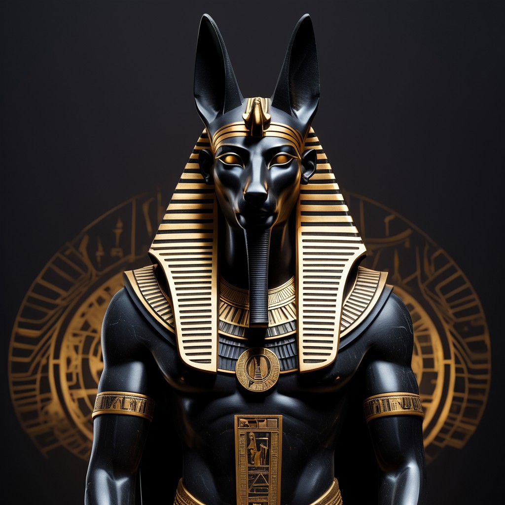 Masterpiece sculpture of Anubis "God of Death" in a futuristic reinterpretation, avant-Egyptian, The Monumental god figure is immensely complex and futuristic. Sculpted in black granite with an ultra smooth finish and gold inlays, modular, sacred hieroglyphs. Dark background with projected dim Egyptian symbology made of light. Grand and sober. Portrait shot, center focus, laser-cut, hyper-detail, Sci-fy, futuristic-avant-Egyptian