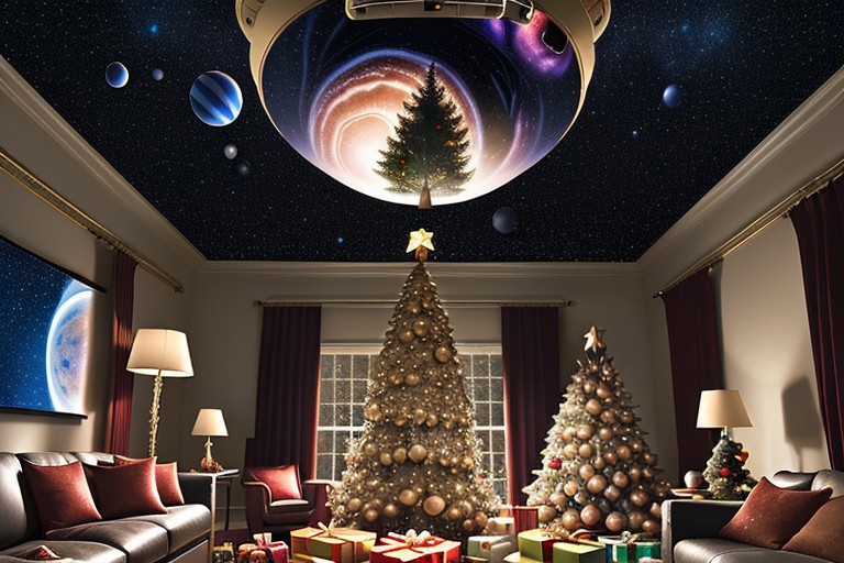 whimsical Christmas living room suspended in a vast, glowing galaxy, with planets and stars as ornaments on a floating tree, comet trails streaking across the room, and astronauts delivering presents on jetpacks.