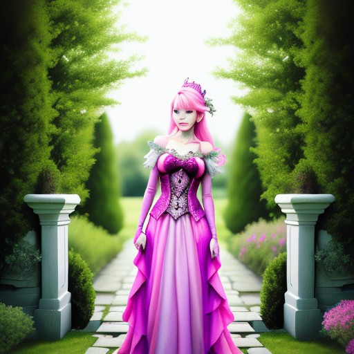 A woman with elaborate fairy-like clothing; the woman has pink skin and fairy clothing, the woman poses in a beautiful garden