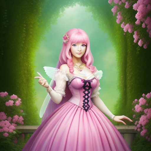 A woman with elaborate fairy-like clothing; the woman has pink skin and fairy clothing, the woman poses in a beautiful garden