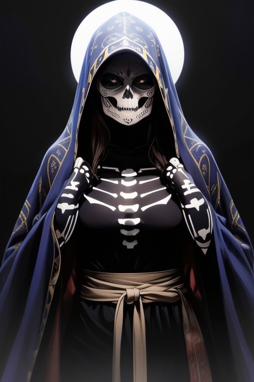 upper body,beautiful eyes, beautiful girl, high detail skin, high detail eyes, high detail hair, highres, ultra detailed, sharpen picture, Highly detailed, masterpiece, best quality, photorealistic, <lora:MuerataLoRA:0.7> A cloaked figure with a skeletal face wears a dark hooded robe adorned with symbols. The robe has a wide sash around the waist and a pattern resembling a web on the chest. The figure stands confidently with its arms at its sides, surrounded by a dripping black effect.