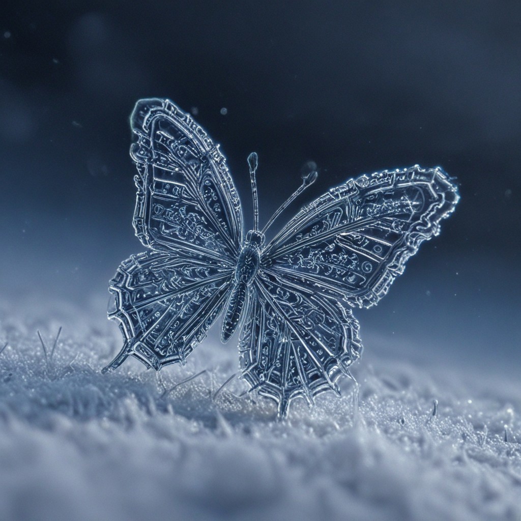 (snowflake focus), snowflake, A lovely butterfly, its wings are composed of snowflakes, flying in a snowy environment., highlighting its delicate details, with snowy and vibrant background, masterpiece, amazing quality, best quality, 4k, ray tracing, intricate details, highly-detailed, hyper-realistic, 8k RAW Editorial Photo,