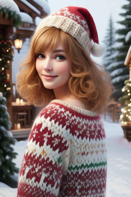 (masterpiece, best quality, intricate detail, delicate patterns), christmassweater, Swedish girl, 22yo, pale white skin, extremely cute face, Santa costume, sweater, cosplay, warm clothes, santa hat, looking back, short curly blonde hair, bob cut, cute bangs, smile, enjoying, blush, outdoor, winter, snow, log house, fantasy, shrine, star, aura, glow,