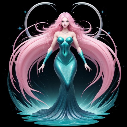 The image is a digital artwork featuring a fantastical, mermaid-like figure set against a solid black background. The mermaid is depicted in a stylized, fantastical manner with a blend of human and aquatic features. She has a slender, elongated body with a humanoid torso, ending in a shimmering, iridescent tail that transitions from a soft pink at the top to a gradient of pastel pink and white towards the end.
