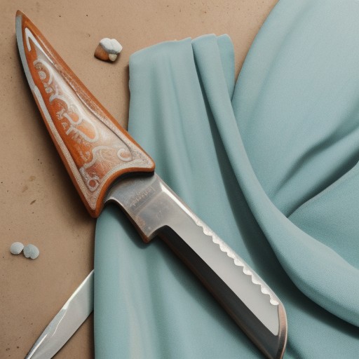 a beautiful ancient knife is cutting through cyan satin, knife closeup