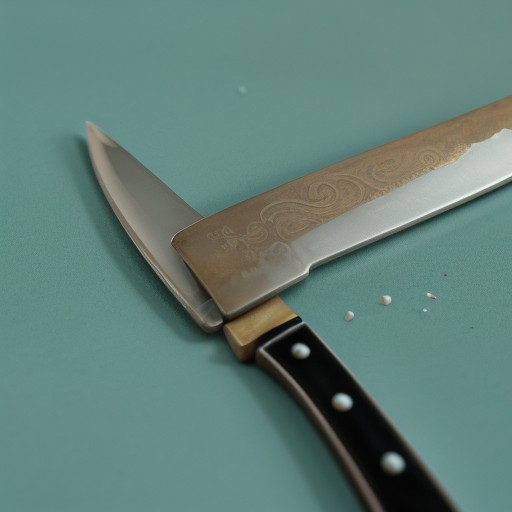 a beautiful ancient knife is cutting through cyan satin, knife closeup