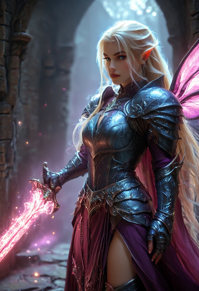 score_9, score_8_up, score_7_up, pov from the side, dynamic pose, beautiful, blonde hair, female elf, glowing green eyes, long hair, big breasts, pink lipstick, dark purple leather armor, holding enchanted shortsword, dungeon background, BREAK (((fully clothed)))