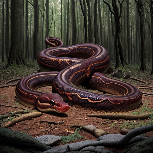 two very long very thick very muscular dark red phallic-like glossy powerful snakes with huge knots rising up and coiled around each other together in a stone pit full of dark red blod n a forest
