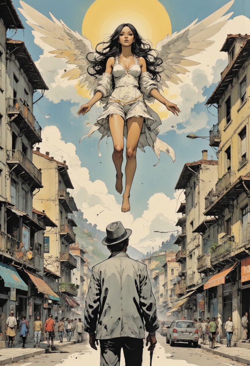 Mangaka style. zydInk In the city of Bogota, Colombia, an older man seen from behind is standing in the streets looking upward. The man is dressed well, in a silver colored suit and jacket with a grey fedora. A beautiful tanned, Spanish skin toned Angel with black hair and dark eyes reaches down toward the man. Silver and gold light highlight clouds and the edges of frame. There is an otherworldly beauty surrounding the man and the angel. illustration by Alessandro 'Talexi' Taini,Stylized watercolor visuals, ultra detailed art, complex Illustration by Tran Nguyen Jeremy Mann Frank Frazetta Carne Griffiths, WLOP, Intricate, Complex contrast, HDR, Sharp, soft Cinematic Volumetric lighting, soft colors