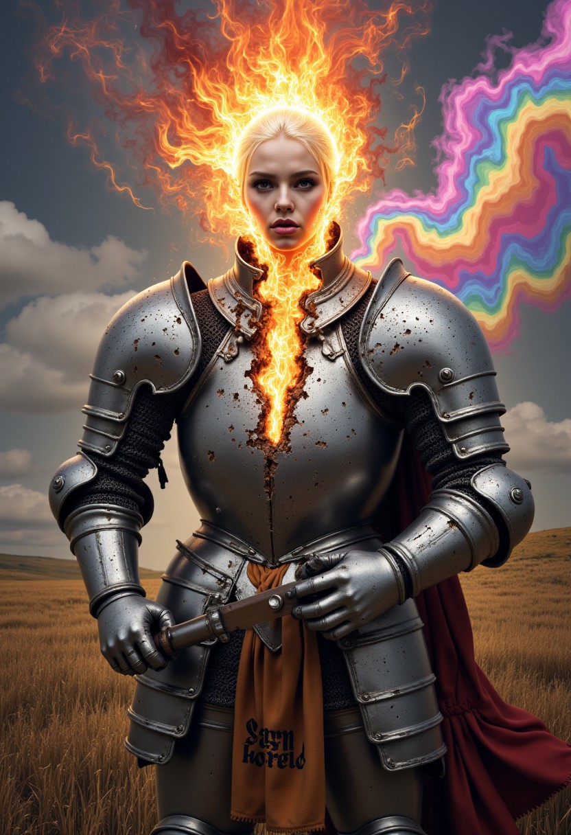 a picture shows a knight in armour, but it is decaying and warping, opening up and revealing a strange alien woman inside. She is emanating psychedelic multicoloured light like a flame. The landscape behind her is also unravelling into a stream of strobic colours.