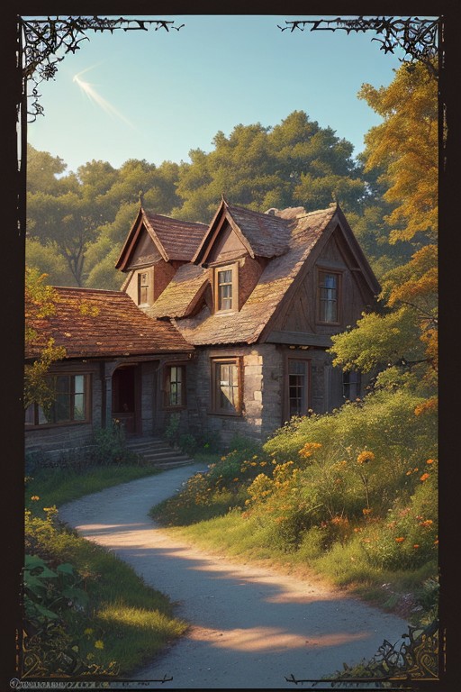Old, dilapidated, majestic, house, (detailed wall texture: 1.2), brown golden paint, chimney on roof, slanted roof, centered in frame, against Sun , (sunlight: 1.1), light, beautiful morning sky, landscape centered next to garden, fantasy style, light tone, dramatic lighting, (bright light, slightly elevated perspective, photorealistic style, digital art, bright yellows, deep blacks, warm reds, soft blues, green landscape; (detailed branches:1.1), slightly out of focus, sun dominating upper portion of image