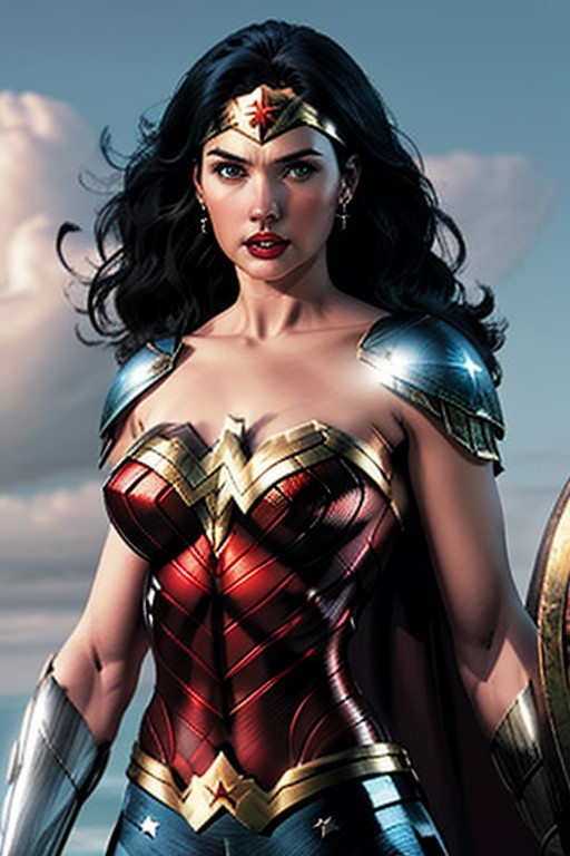1girl,(wonder woman)weapon, polearm, wonder womans shield, solo, holding, holding polearm, holding weapon, spear,holding a lasso,the lasso of truth , jewelry, nail polish, outdoors, earrings, wonder woman attire, holding wonder woman shield, looking at viewer, armor, cape, blurry, sky, belt, headband, cloud, blue nails, Jim Lee style,blurrybackground, lips, zPDXL3, detailxl, Score_PnyReal