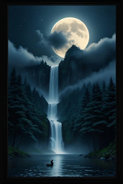 This image is a digitally manipulated dark fantasy photograph of a night sky with a surreal, dreamlike quality. An open old golden frame can be seen in the middle of the cloudy sky image. Not a single wall is visible outside the golden frame. In the frame itself we see a magical miniature huge waterfall flowing into a raging river, tall trees, 2 birds fly out of the window. The river pours powerfully and massively over the lower frame! Extending to the bottom edge of the picture. The sky framing the entire frame has a few delicate clouds and a full illuminating moon who gives the picture a bokeh atmosphere. Inside the golden frame we can see the magical miniature waterfall landscape. The outside of the frame is a cloudy night sky with occasional delicate clouds. Not a single wall or wall is visible! Outside the frame, we see a cloudy sky in magical moonlight with occasional delicate clouds. This gives the image a very surreal and imaginative quality.