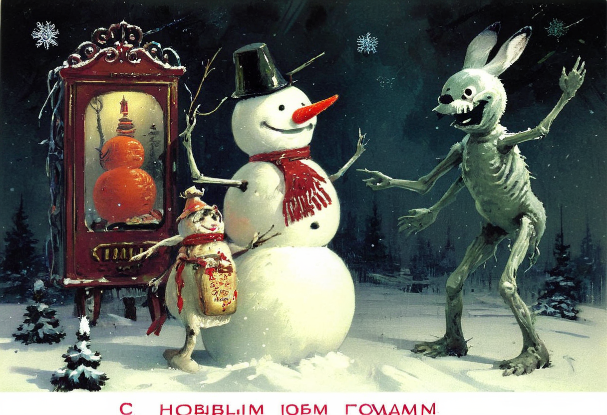 <lora:mgl_Soviet_New_Year_Postcards>, 100 spirits bottles, detailxl, soviet new year postcard, (s novym godom logo:1), winter, space, cosmic landscape, scifi, dusk, style of Peter Wileman, Alvaro Castagnet, jeremy mann, anders zorn, john harris, bob layzell, john berkey, shade of vivid colors, xenomorph, scifi, horror vibes, Creepy, real image of a grotesque creature with unnaturally long limbs in a dimly lit hallway, pale skin with bulging veins, empty black eyes, wide mouth filled with sharp, jagged teeth, decorations,rabbit,red square,snowflakes,snowman,