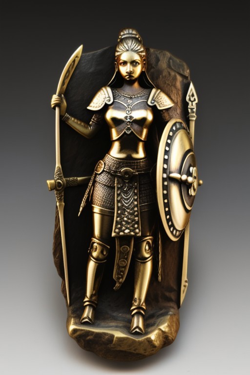detailed klamra brass relief 1woman Viking warrior with sword and shield, fight scene, studio lighting <lora:Klamra:1>