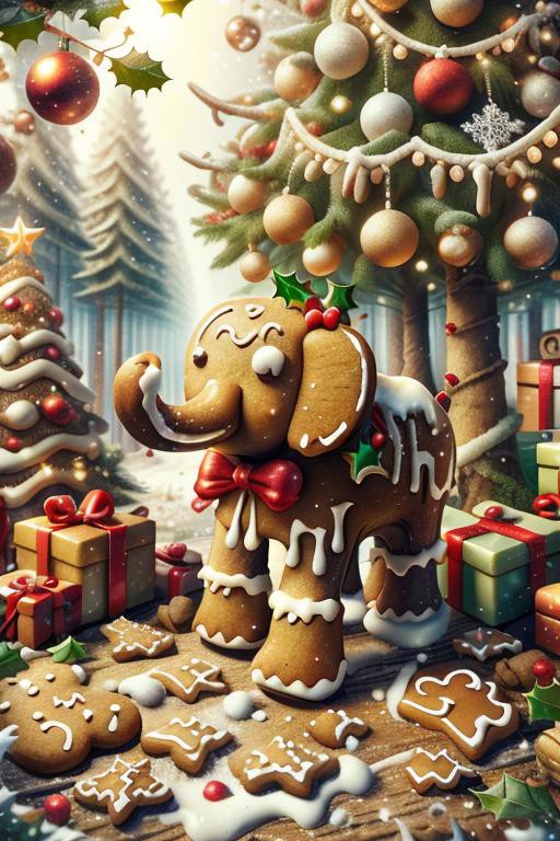 outdoors, forest, gingerbread elephant, walking, ChristmasDecorativeStyle, food, cookie, food focus, no humans