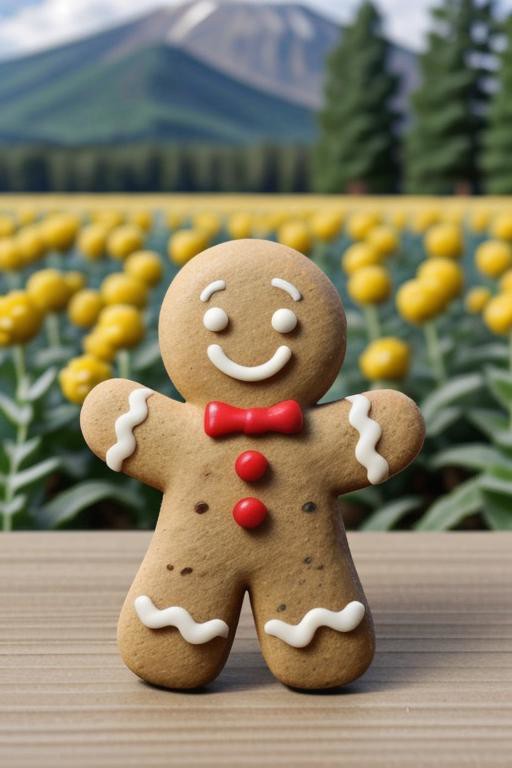 realistic, outdoors, water, trees, scenery, fields, Gingerbread_Man, food, cookie, food focus, no humans