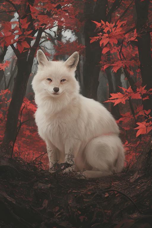 In the realm of fantasy, a small, pure white fox kit sits serenely amidst a storm of falling crimson leaves in a dark, mysterious forest. The ethereal atmosphere is accentuated by the soft and diffused lighting, with deep blacks and vibrant reds dominating the color palette. The scene evokes a sense of melancholic beauty, inspired by the works of Yoshitaka Amano and Artgerm. The smooth fur of the fox contrasts with the slightly blurry, almost ethereal texture of the leaves, while the background showcases a shadowy forest with implied depth. The overall rendering focuses on mood and atmosphere, with an impressionistic touch that prioritizes depth of field and a slight focus on the fox. This captivating illustration, with its cinematic qualities and poster-worthy appeal, transports viewers into a world of enchanting wonder. Ultra High Resolution photo. Frost-covered leaves in vibrant shades of red and orange, delicately encased in glistening ice crystals. The scene captures a close-up view of the foliage, emphasizing texture and detail; the soft, fragile frost contrasts with the vivid colors of the leaves. The background features blurred greens and dark hues, enhancing the focus on the frost-laden leaves. The aesthetic is hyperrealistic, showcasing the intricate patterns of frost and the rich saturation of autumn colors. The lighting is soft yet illuminating, creating a serene atmosphere of a cold morning.
