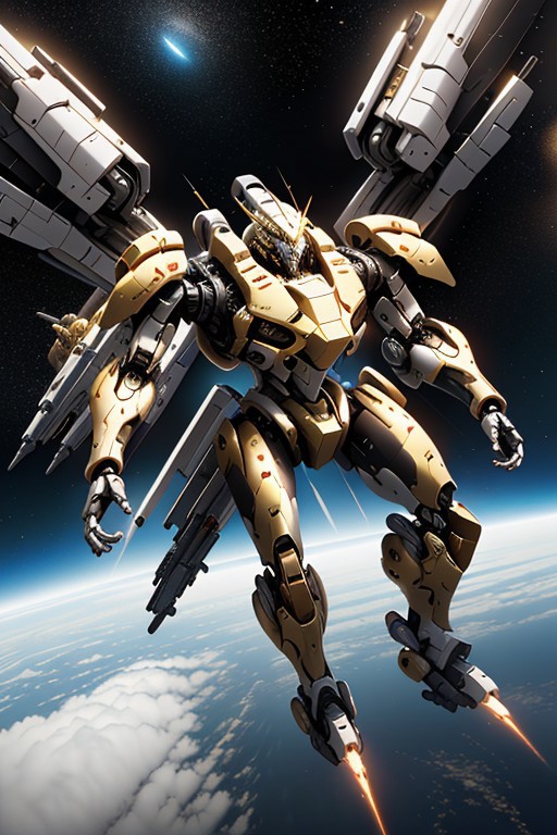 zzmckzz, mecha armor, gold color mecha armor theme, (flying toward the viewer:1.20), armaments equipped in the armor, (right hand holding beam rifle:1.20), space in the background:0.8