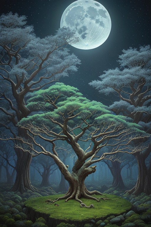 Large, gnarled, majestic, 2 trees, (detailed trunk texture: 1.2), silver bark, centered in frame, against moon , (cold moonlight: 1.1), light, beautiful night sky, landscape centered next to river, fantasy style, light tone, dramatic lighting, (dim light, slightly elevated perspective, photorealistic style, digital art, soft yellows, deep blacks, cold whites, warm reds, soft blues, green landscape; (detailed branches:1.1), slightly out of focus, moon dominating upper portion of image, fantasy tree, green hill, epic, oil painting