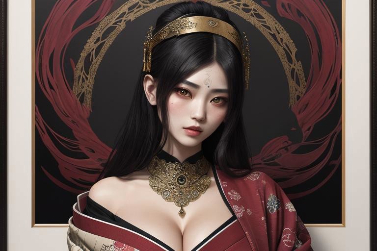 safe_pos, A traditional Japanese ink-on-paper masterpiece blending wabi-sabi aesthetics with a sensual, surreal edge. The artwork features an erotic yet stunning oriental priestess, her delicate face framed by flowing dark hair, bangs, sidelocks. Her captivating green irises glow softly, contrasting against her pale skin, as she gazes seductively at the viewer. Sepia and carmine ink flow harmoniously, She is wearing traditional kimono that slips from her shoulders, revealing deep cleavage. Abstract swirls of henna-hued patterns flow around her form, creating a sense of ethereal movement. Vibrant splashes of surreal colors—a muted crimson, soft gold, and smoky charcoal—enhance the ink composition, giving it life while embracing the imperfections and fluidity of wabi-sabi. The priestess embodies a mystical yet erotic presence, seamlessly merging traditional Japanese beauty with surreal allure
